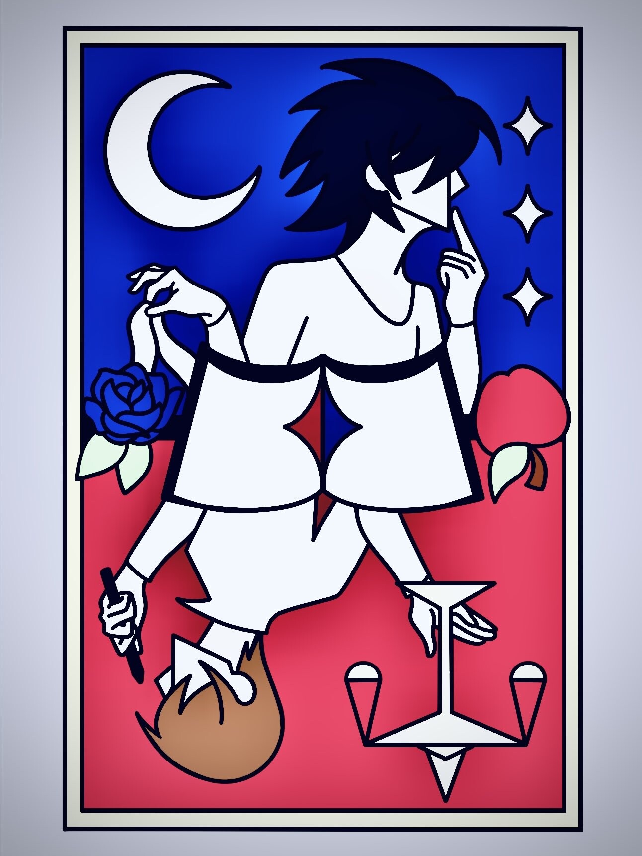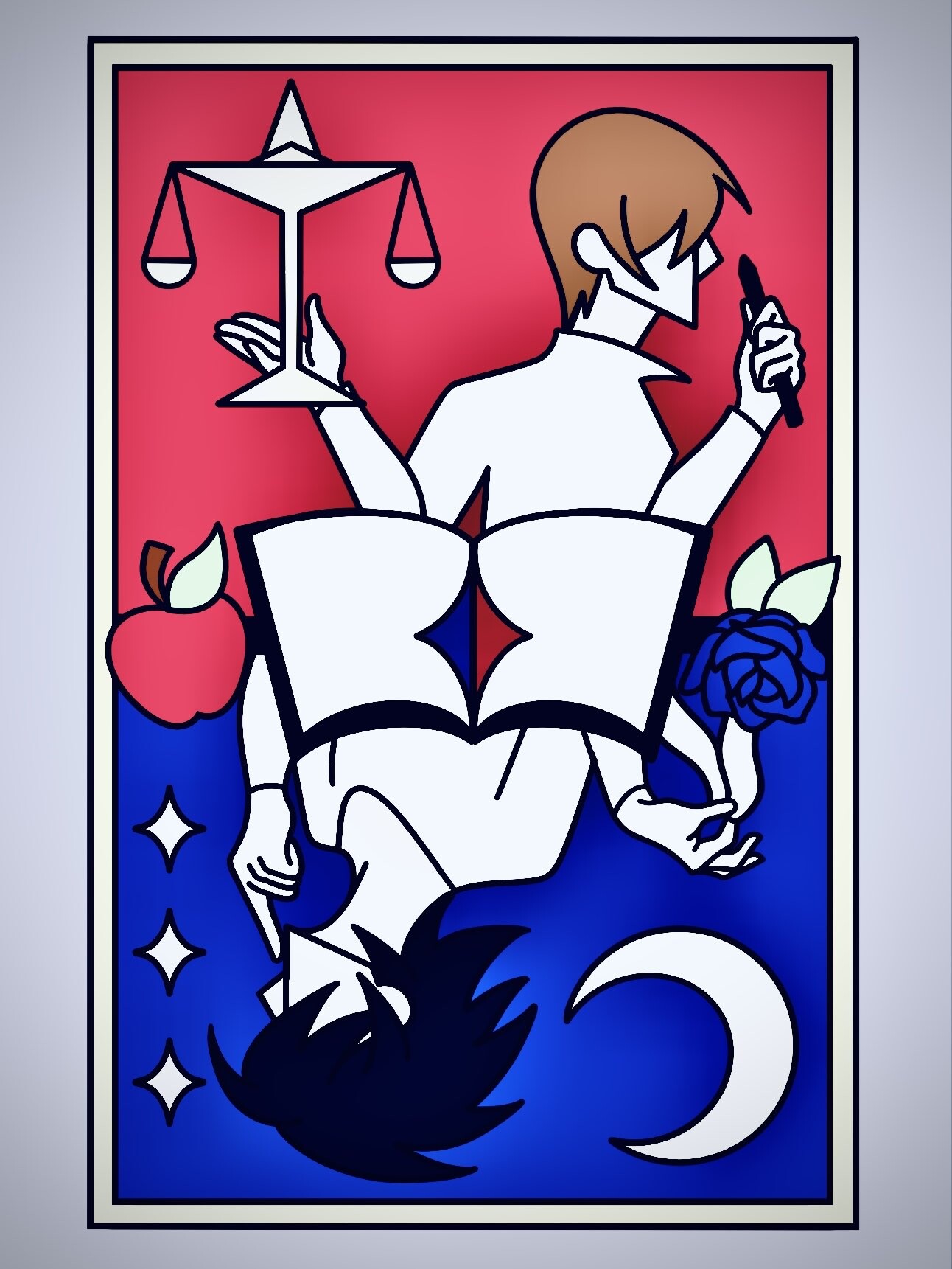 I thought it would be cool to make a combination tarot for these two- so they each have a little piece of the Justice arcana! Light has the scales and L has (is discarding) the blindfold. I hope you enjoy!